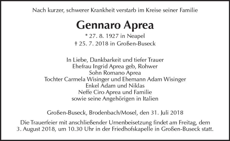 Hier finden Sie alle Traueranzeigen aus der Zeitung, die bisher für Gennaro Aprea erschienen sind. Weitere Traueranzeigen, die in der Zeitung erscheinen, werden hier ebenfalls aufgelistet