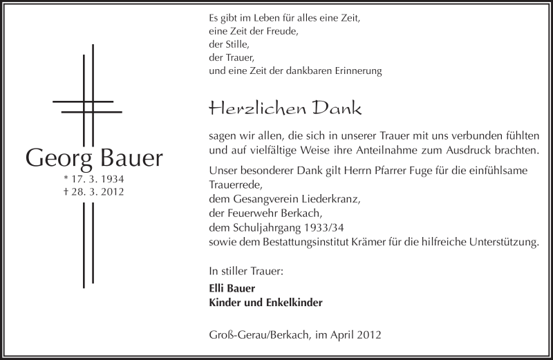Hier finden Sie alle Traueranzeigen aus der Zeitung, die bisher für Georg Bauer erschienen sind. Weitere Traueranzeigen, die in der Zeitung erscheinen, werden hier ebenfalls aufgelistet