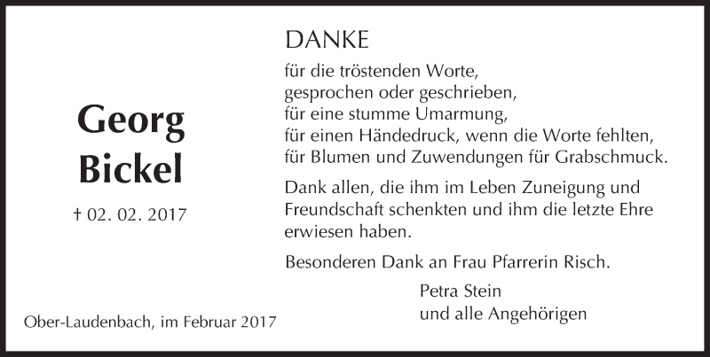 Hier finden Sie alle Traueranzeigen aus der Zeitung, die bisher für Georg Bickel erschienen sind. Weitere Traueranzeigen, die in der Zeitung erscheinen, werden hier ebenfalls aufgelistet