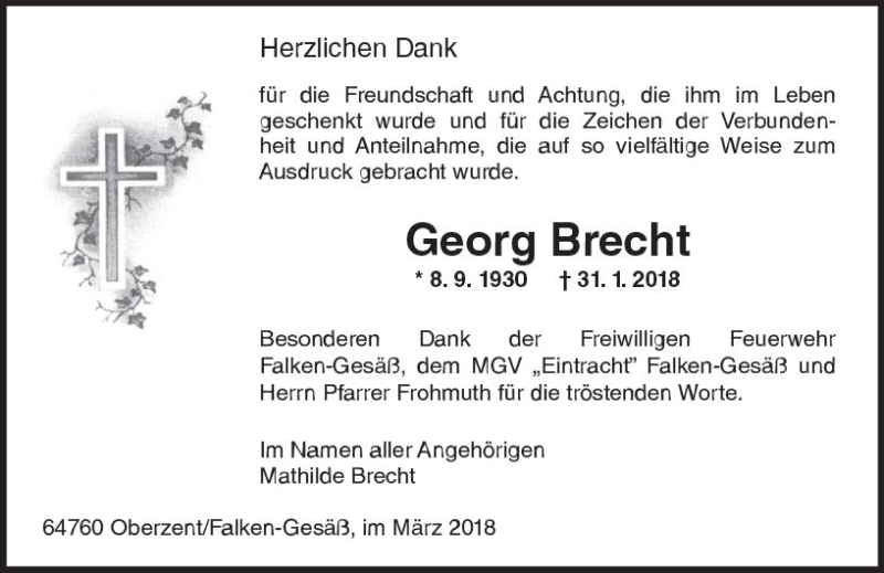 Hier finden Sie alle Traueranzeigen aus der Zeitung, die bisher für Georg Brecht erschienen sind. Weitere Traueranzeigen, die in der Zeitung erscheinen, werden hier ebenfalls aufgelistet