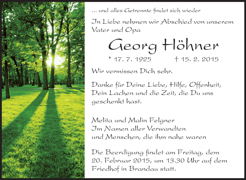 Hier finden Sie alle Traueranzeigen aus der Zeitung, die bisher für Georg Höhner erschienen sind. Weitere Traueranzeigen, die in der Zeitung erscheinen, werden hier ebenfalls aufgelistet