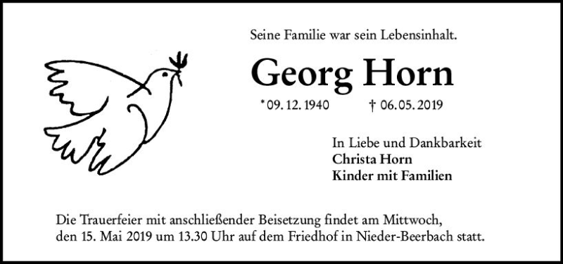 Hier finden Sie alle Traueranzeigen aus der Zeitung, die bisher für Georg Horn erschienen sind. Weitere Traueranzeigen, die in der Zeitung erscheinen, werden hier ebenfalls aufgelistet