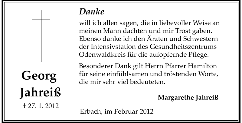 Hier finden Sie alle Traueranzeigen aus der Zeitung, die bisher für Georg Jahreiß erschienen sind. Weitere Traueranzeigen, die in der Zeitung erscheinen, werden hier ebenfalls aufgelistet