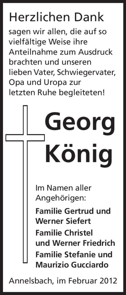 Hier finden Sie alle Traueranzeigen aus der Zeitung, die bisher für Georg König erschienen sind. Weitere Traueranzeigen, die in der Zeitung erscheinen, werden hier ebenfalls aufgelistet
