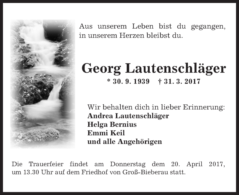 Hier finden Sie alle Traueranzeigen aus der Zeitung, die bisher für Georg Lautenschläger erschienen sind. Weitere Traueranzeigen, die in der Zeitung erscheinen, werden hier ebenfalls aufgelistet