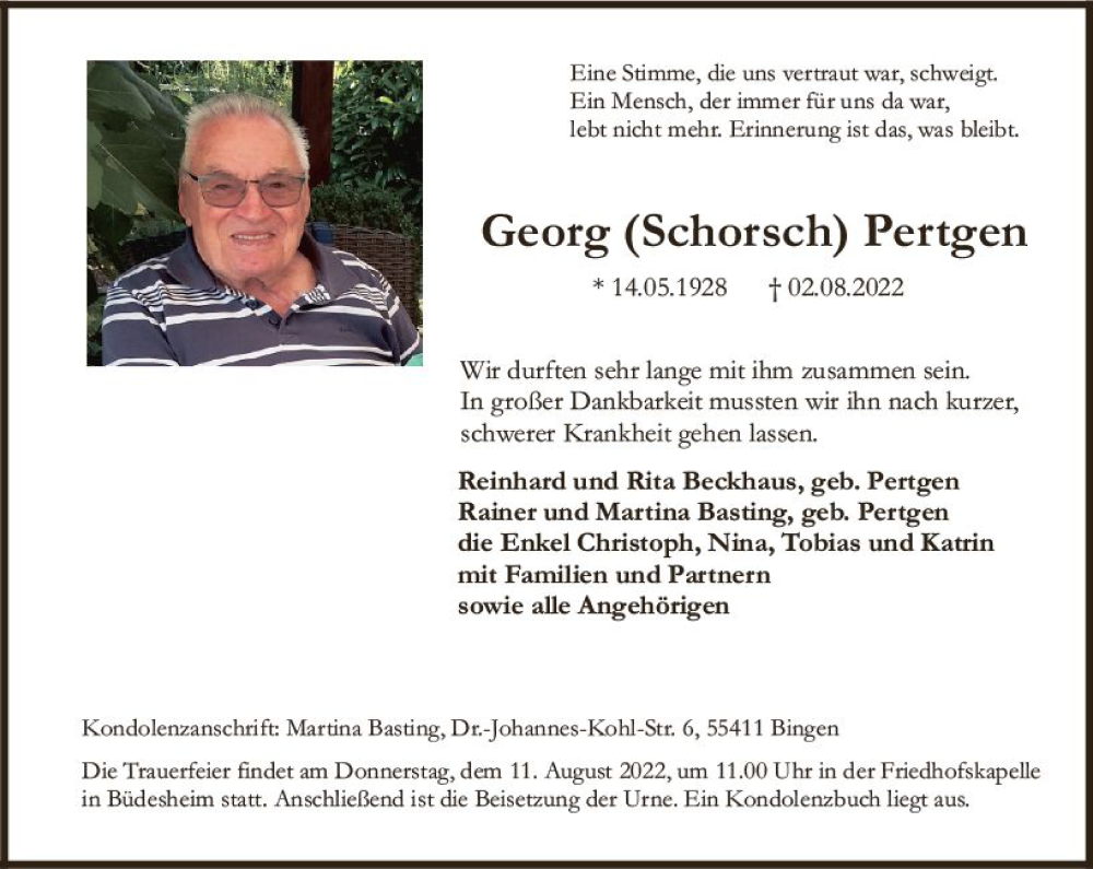 Hier finden Sie alle Traueranzeigen aus der Zeitung, die bisher für Georg Pertgen erschienen sind. Weitere Traueranzeigen, die in der Zeitung erscheinen, werden hier ebenfalls aufgelistet