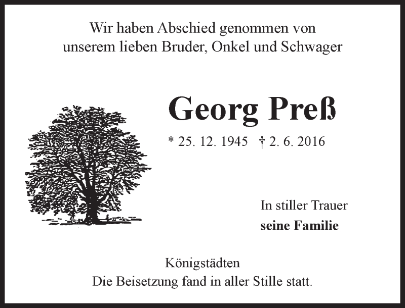 Hier finden Sie alle Traueranzeigen aus der Zeitung, die bisher für Georg Preß erschienen sind. Weitere Traueranzeigen, die in der Zeitung erscheinen, werden hier ebenfalls aufgelistet