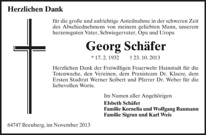 Hier finden Sie alle Traueranzeigen aus der Zeitung, die bisher für Georg Schäfer erschienen sind. Weitere Traueranzeigen, die in der Zeitung erscheinen, werden hier ebenfalls aufgelistet