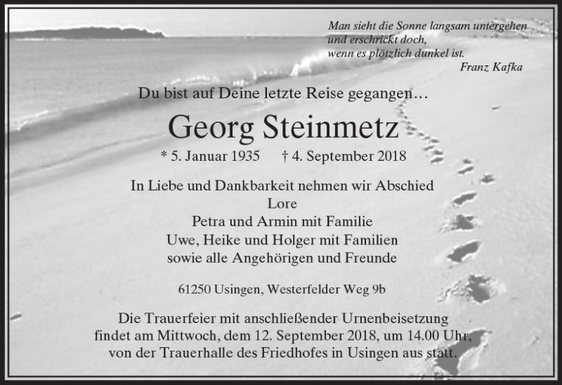 Hier finden Sie alle Traueranzeigen aus der Zeitung, die bisher für Georg Steinmetz erschienen sind. Weitere Traueranzeigen, die in der Zeitung erscheinen, werden hier ebenfalls aufgelistet