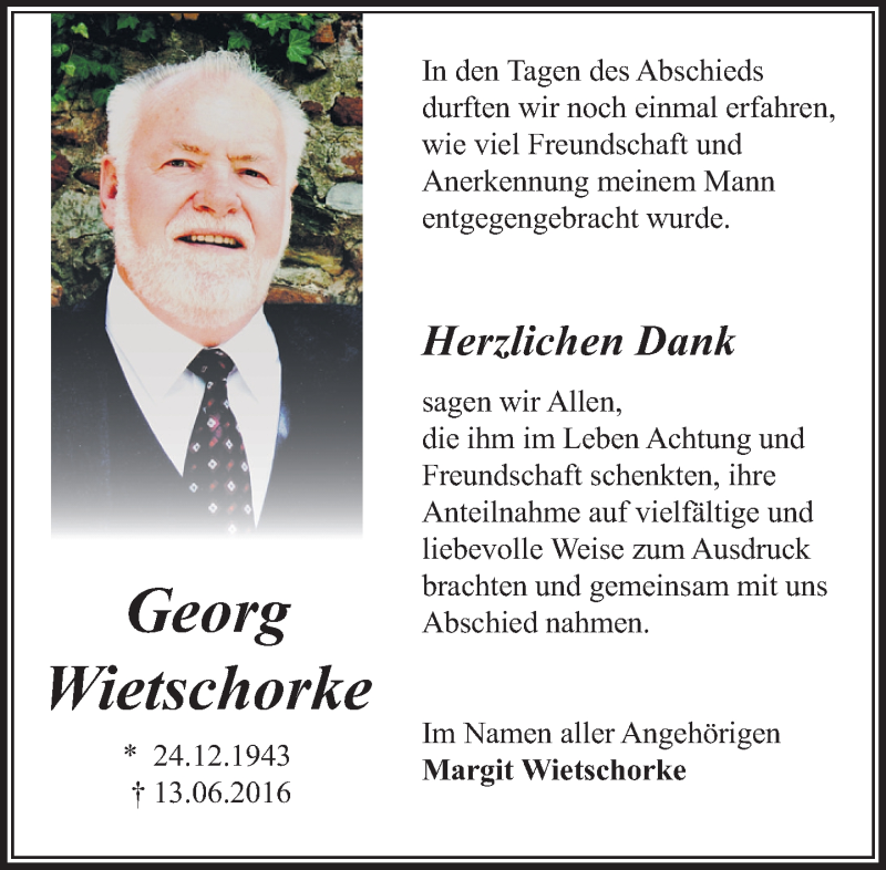 Hier finden Sie alle Traueranzeigen aus der Zeitung, die bisher für Georg Wietschorke erschienen sind. Weitere Traueranzeigen, die in der Zeitung erscheinen, werden hier ebenfalls aufgelistet