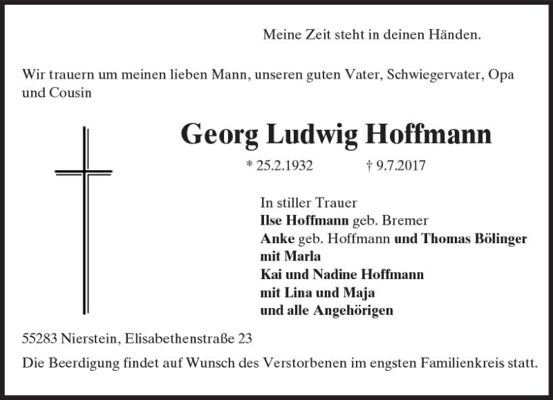 Hier finden Sie alle Traueranzeigen aus der Zeitung, die bisher für Georg Ludwig Hoffmann erschienen sind. Weitere Traueranzeigen, die in der Zeitung erscheinen, werden hier ebenfalls aufgelistet