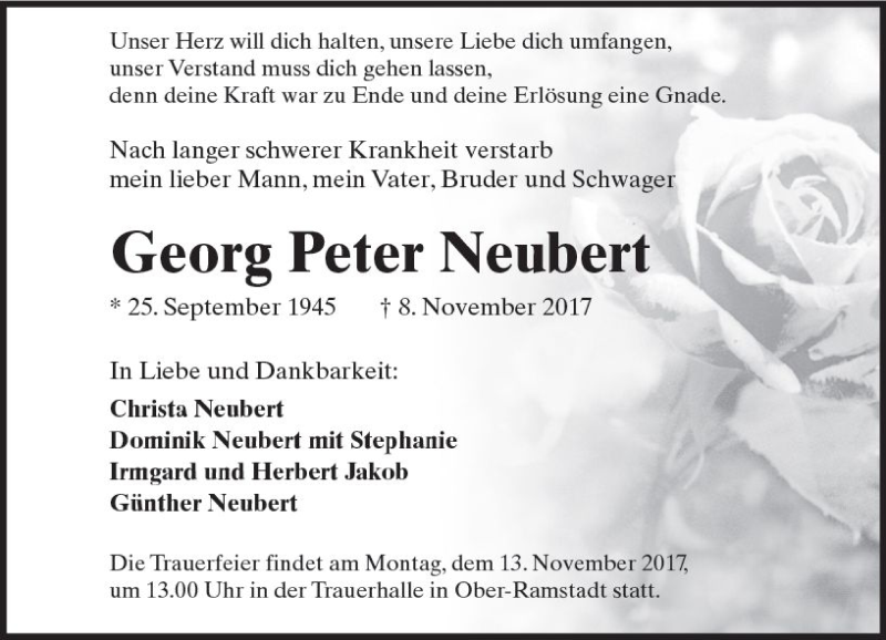 Hier finden Sie alle Traueranzeigen aus der Zeitung, die bisher für Georg Peter Neubert erschienen sind. Weitere Traueranzeigen, die in der Zeitung erscheinen, werden hier ebenfalls aufgelistet