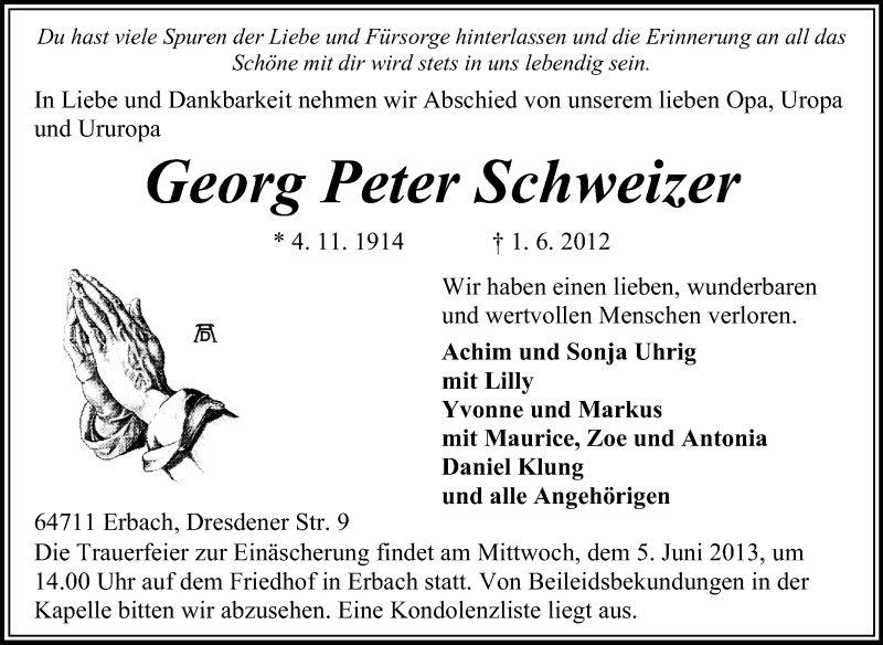 Hier finden Sie alle Traueranzeigen aus der Zeitung, die bisher für Georg Peter Schweizer erschienen sind. Weitere Traueranzeigen, die in der Zeitung erscheinen, werden hier ebenfalls aufgelistet
