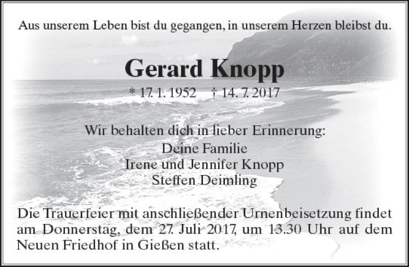 Hier finden Sie alle Traueranzeigen aus der Zeitung, die bisher für Gerard Knopp erschienen sind. Weitere Traueranzeigen, die in der Zeitung erscheinen, werden hier ebenfalls aufgelistet