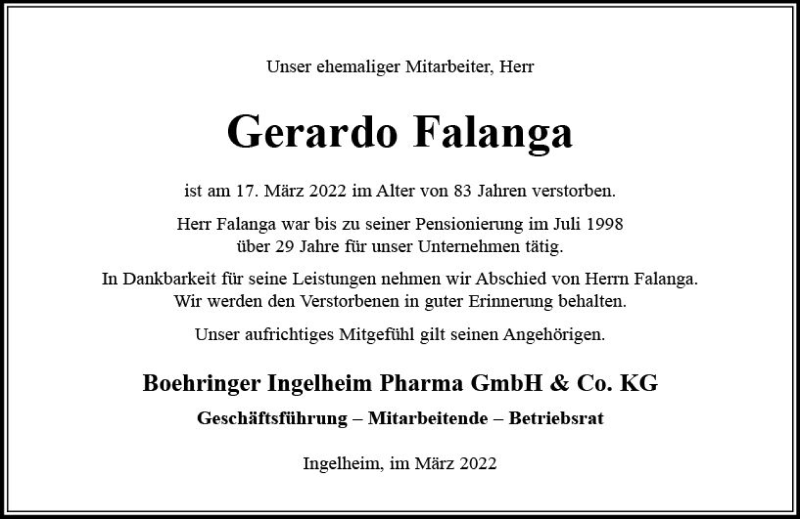 Hier finden Sie alle Traueranzeigen aus der Zeitung, die bisher für Gerardo Falanga erschienen sind. Weitere Traueranzeigen, die in der Zeitung erscheinen, werden hier ebenfalls aufgelistet
