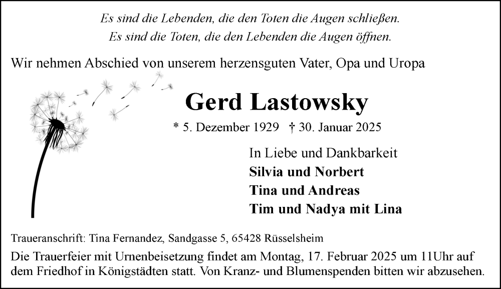 Hier finden Sie alle Traueranzeigen aus der Zeitung, die bisher für Gerd Lastowsky erschienen sind. Weitere Traueranzeigen, die in der Zeitung erscheinen, werden hier ebenfalls aufgelistet