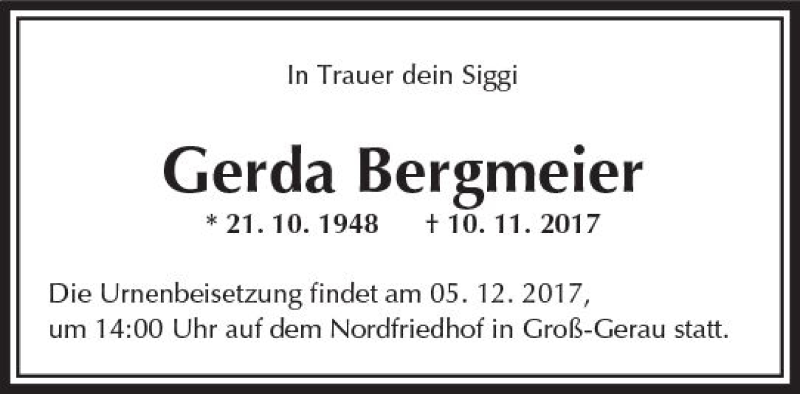 Hier finden Sie alle Traueranzeigen aus der Zeitung, die bisher für Gerda Bergmeier erschienen sind. Weitere Traueranzeigen, die in der Zeitung erscheinen, werden hier ebenfalls aufgelistet