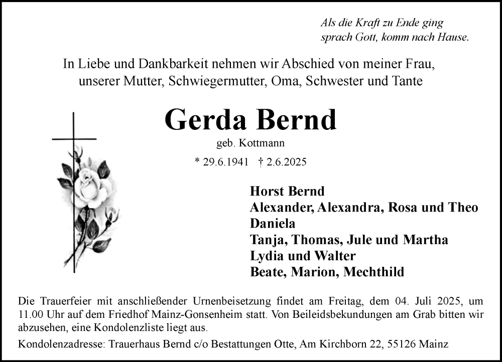 Hier finden Sie alle Traueranzeigen aus der Zeitung, die bisher für Gerda Bernd erschienen sind. Weitere Traueranzeigen, die in der Zeitung erscheinen, werden hier ebenfalls aufgelistet