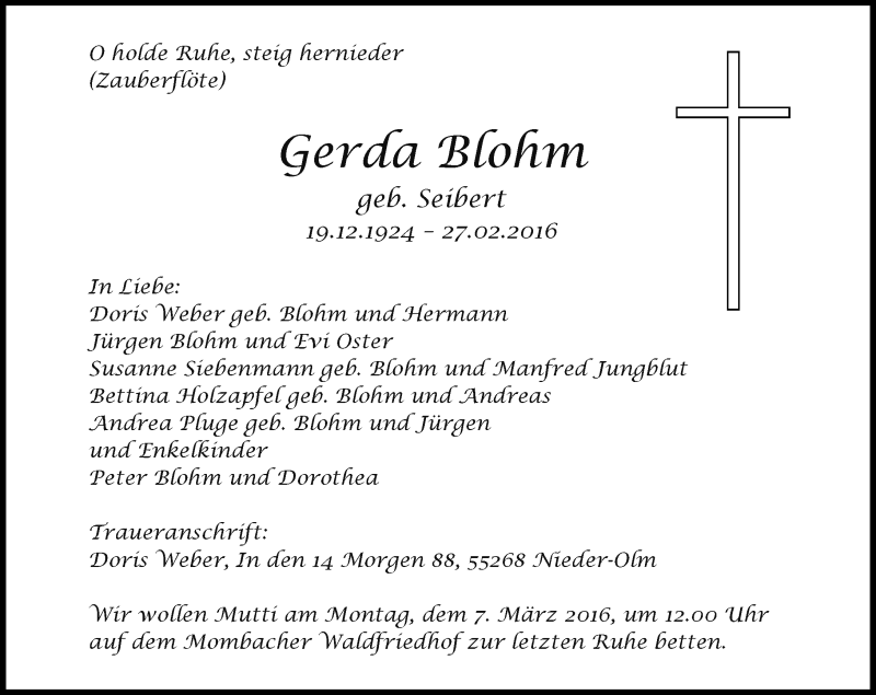 Hier finden Sie alle Traueranzeigen aus der Zeitung, die bisher für Gerda Blohm erschienen sind. Weitere Traueranzeigen, die in der Zeitung erscheinen, werden hier ebenfalls aufgelistet