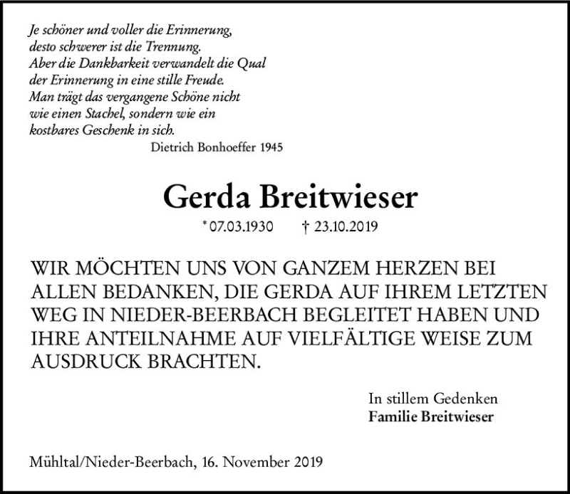 Hier finden Sie alle Traueranzeigen aus der Zeitung, die bisher für Gerda Breitwieser erschienen sind. Weitere Traueranzeigen, die in der Zeitung erscheinen, werden hier ebenfalls aufgelistet