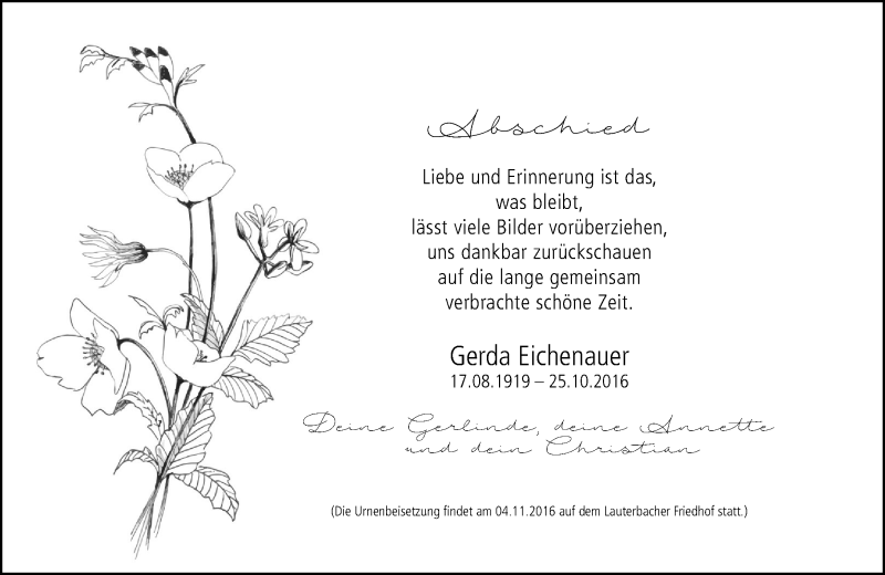 Hier finden Sie alle Traueranzeigen aus der Zeitung, die bisher für Gerda Eichenauer erschienen sind. Weitere Traueranzeigen, die in der Zeitung erscheinen, werden hier ebenfalls aufgelistet