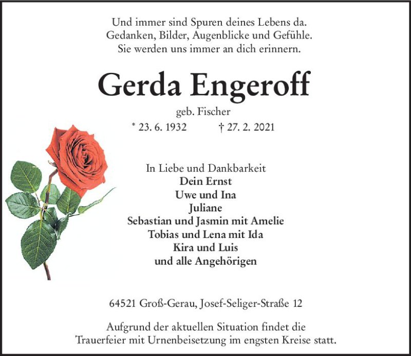Hier finden Sie alle Traueranzeigen aus der Zeitung, die bisher für Gerda Engeroff erschienen sind. Weitere Traueranzeigen, die in der Zeitung erscheinen, werden hier ebenfalls aufgelistet