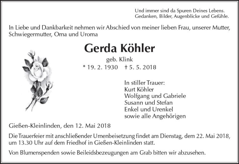 Hier finden Sie alle Traueranzeigen aus der Zeitung, die bisher für Gerda Köhler erschienen sind. Weitere Traueranzeigen, die in der Zeitung erscheinen, werden hier ebenfalls aufgelistet
