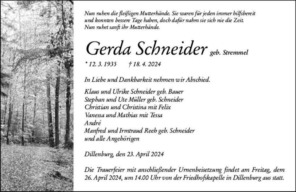 Hier finden Sie alle Traueranzeigen aus der Zeitung, die bisher für Gerda Schneider erschienen sind. Weitere Traueranzeigen, die in der Zeitung erscheinen, werden hier ebenfalls aufgelistet