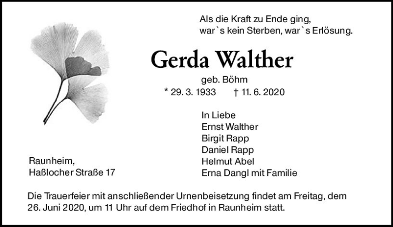 Hier finden Sie alle Traueranzeigen aus der Zeitung, die bisher für Gerda Walther erschienen sind. Weitere Traueranzeigen, die in der Zeitung erscheinen, werden hier ebenfalls aufgelistet