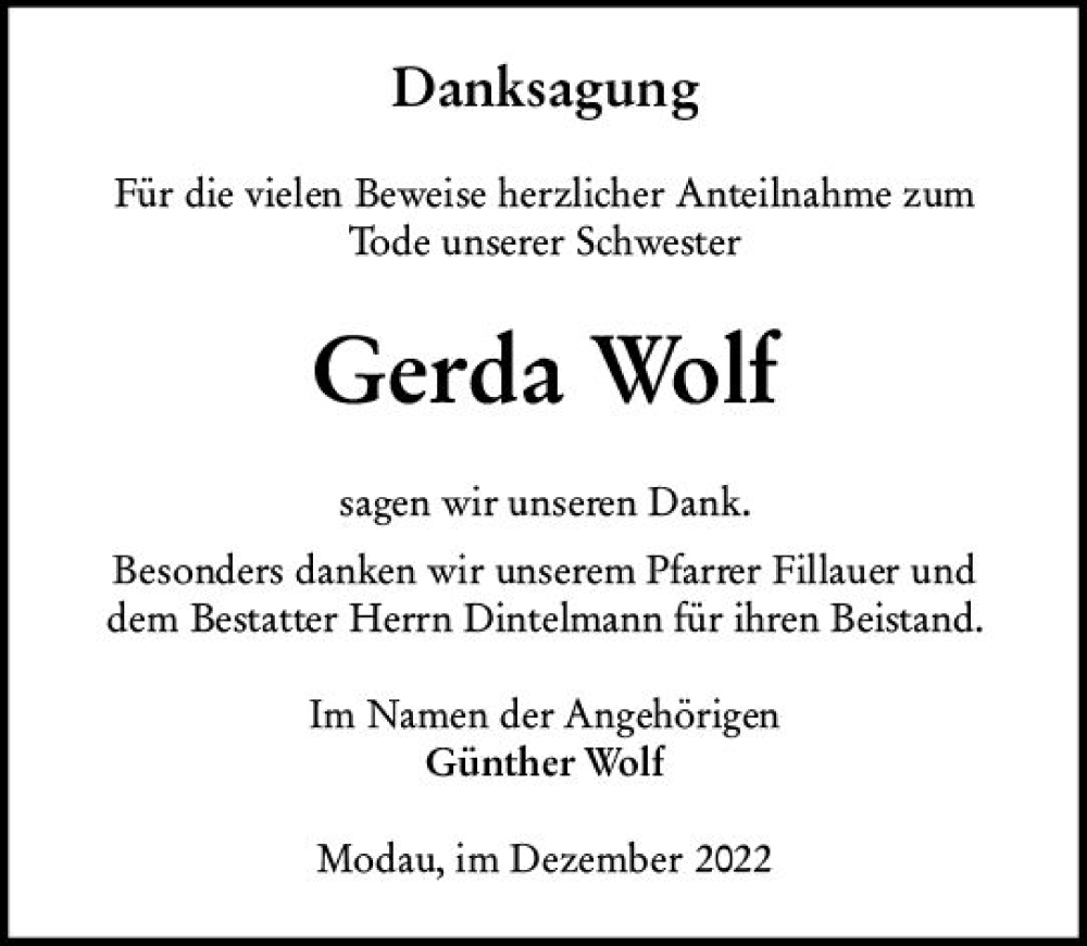 Hier finden Sie alle Traueranzeigen aus der Zeitung, die bisher für Gerda Wolf erschienen sind. Weitere Traueranzeigen, die in der Zeitung erscheinen, werden hier ebenfalls aufgelistet