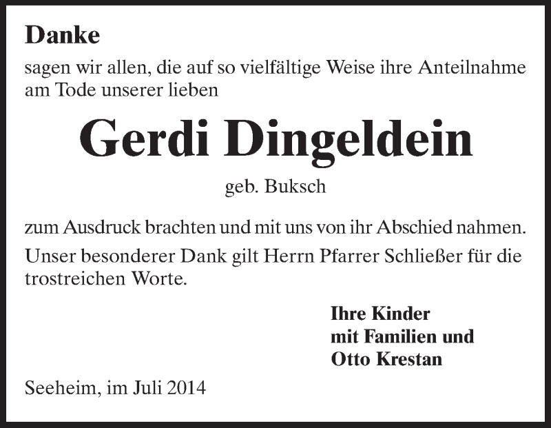 Hier finden Sie alle Traueranzeigen aus der Zeitung, die bisher für Gerdi Dingeldein erschienen sind. Weitere Traueranzeigen, die in der Zeitung erscheinen, werden hier ebenfalls aufgelistet