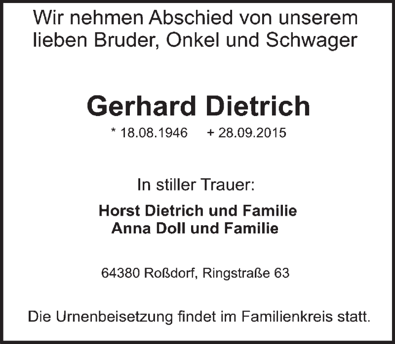 Hier finden Sie alle Traueranzeigen aus der Zeitung, die bisher für Gerhard Dietrich erschienen sind. Weitere Traueranzeigen, die in der Zeitung erscheinen, werden hier ebenfalls aufgelistet