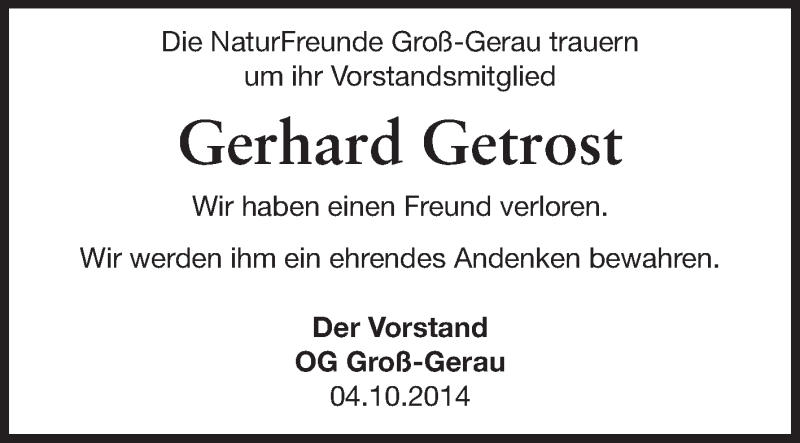 Hier finden Sie alle Traueranzeigen aus der Zeitung, die bisher für Gerhard Getrost erschienen sind. Weitere Traueranzeigen, die in der Zeitung erscheinen, werden hier ebenfalls aufgelistet