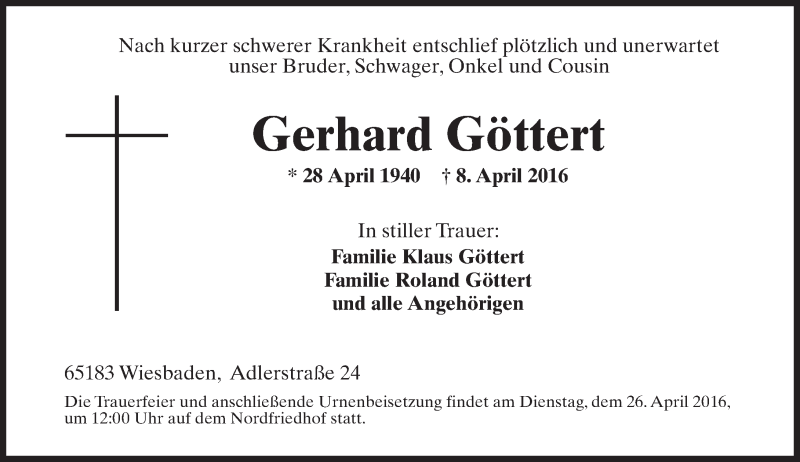 Hier finden Sie alle Traueranzeigen aus der Zeitung, die bisher für Gerhard Göttert erschienen sind. Weitere Traueranzeigen, die in der Zeitung erscheinen, werden hier ebenfalls aufgelistet