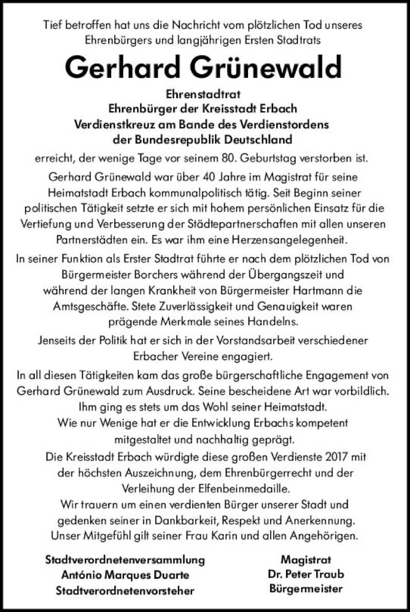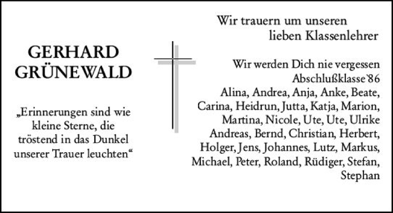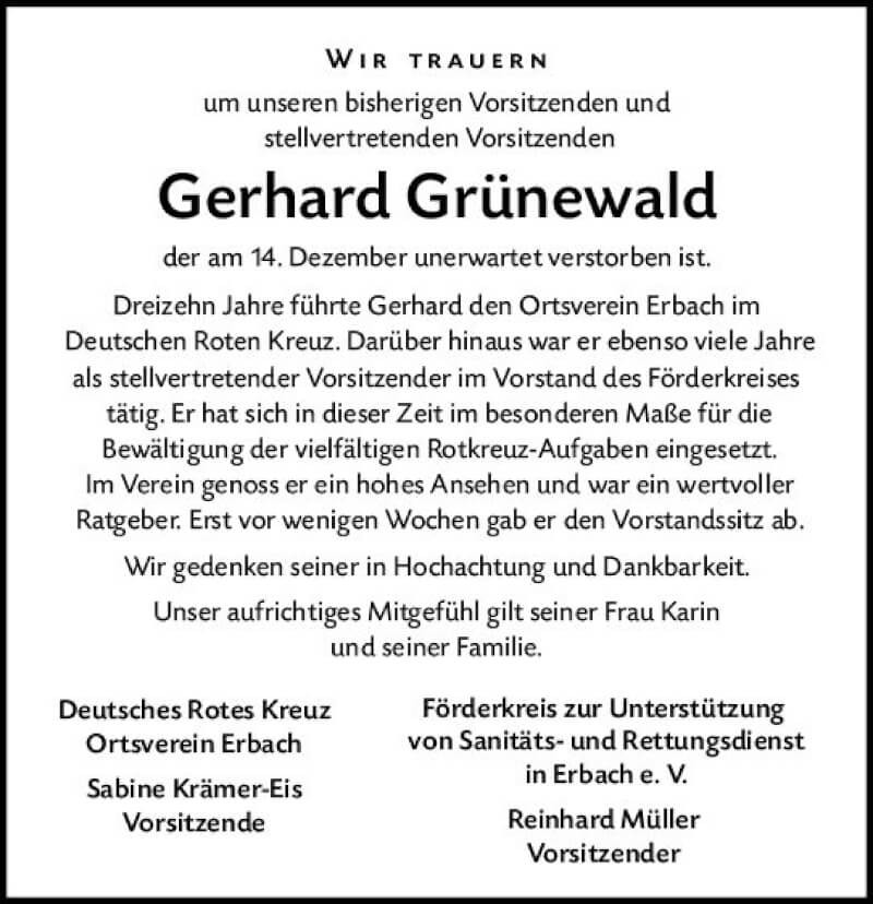 Hier finden Sie alle Traueranzeigen aus der Zeitung, die bisher für Gerhard Grünewald erschienen sind. Weitere Traueranzeigen, die in der Zeitung erscheinen, werden hier ebenfalls aufgelistet