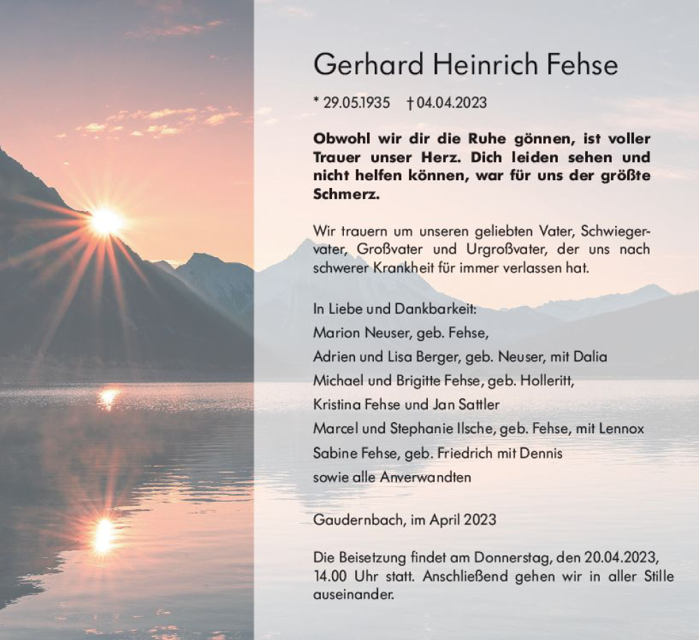 Hier finden Sie alle Traueranzeigen aus der Zeitung, die bisher für Gerhard Heinrich Fehse erschienen sind. Weitere Traueranzeigen, die in der Zeitung erscheinen, werden hier ebenfalls aufgelistet