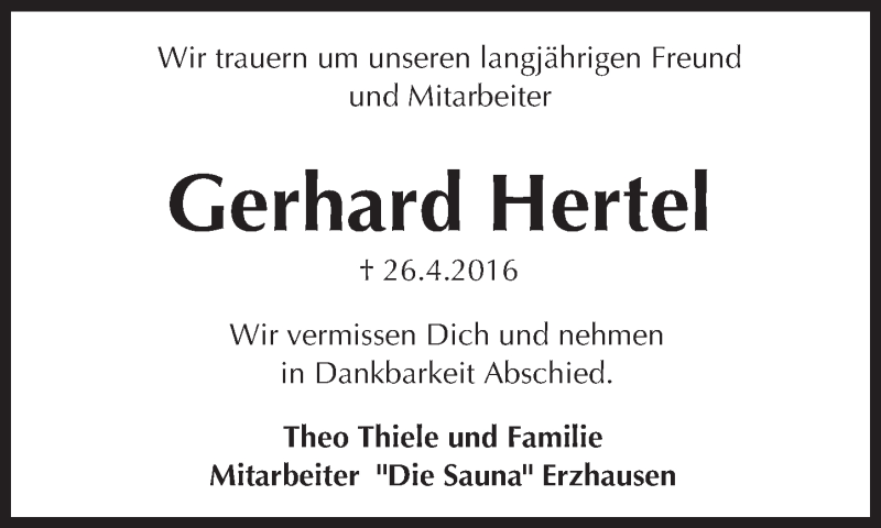 Hier finden Sie alle Traueranzeigen aus der Zeitung, die bisher für Gerhard Hertel erschienen sind. Weitere Traueranzeigen, die in der Zeitung erscheinen, werden hier ebenfalls aufgelistet