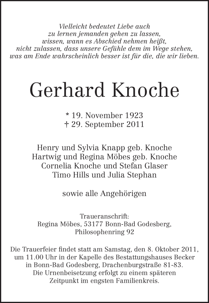 Hier finden Sie alle Traueranzeigen aus der Zeitung, die bisher für Gerhard Knoche erschienen sind. Weitere Traueranzeigen, die in der Zeitung erscheinen, werden hier ebenfalls aufgelistet
