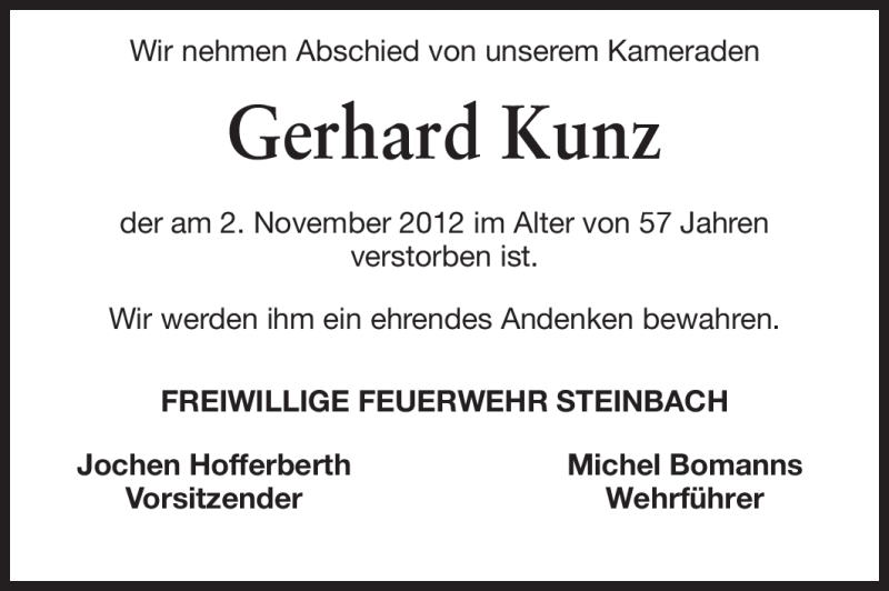 Hier finden Sie alle Traueranzeigen aus der Zeitung, die bisher für Gerhard Kunz erschienen sind. Weitere Traueranzeigen, die in der Zeitung erscheinen, werden hier ebenfalls aufgelistet