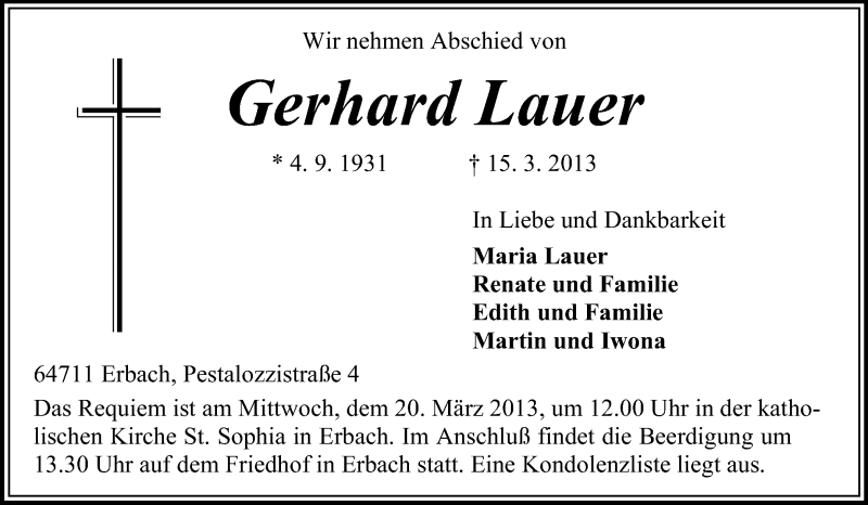 Hier finden Sie alle Traueranzeigen aus der Zeitung, die bisher für Gerhard Lauer erschienen sind. Weitere Traueranzeigen, die in der Zeitung erscheinen, werden hier ebenfalls aufgelistet