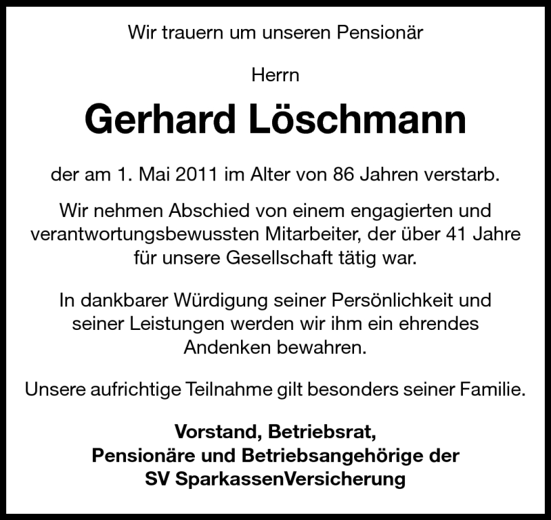 Hier finden Sie alle Traueranzeigen aus der Zeitung, die bisher für Gerhard Löschmann erschienen sind. Weitere Traueranzeigen, die in der Zeitung erscheinen, werden hier ebenfalls aufgelistet