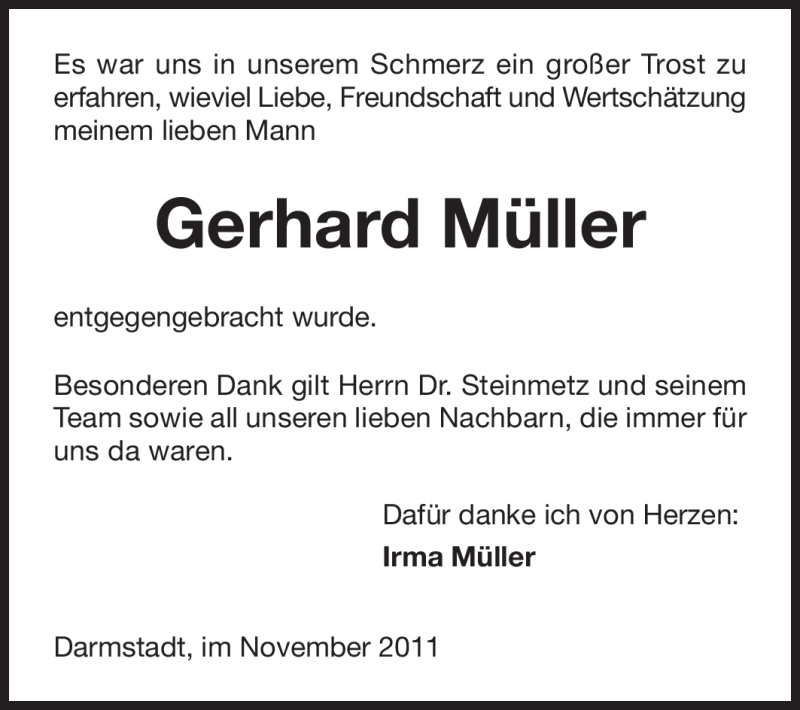 Hier finden Sie alle Traueranzeigen aus der Zeitung, die bisher für Gerhard Müller erschienen sind. Weitere Traueranzeigen, die in der Zeitung erscheinen, werden hier ebenfalls aufgelistet