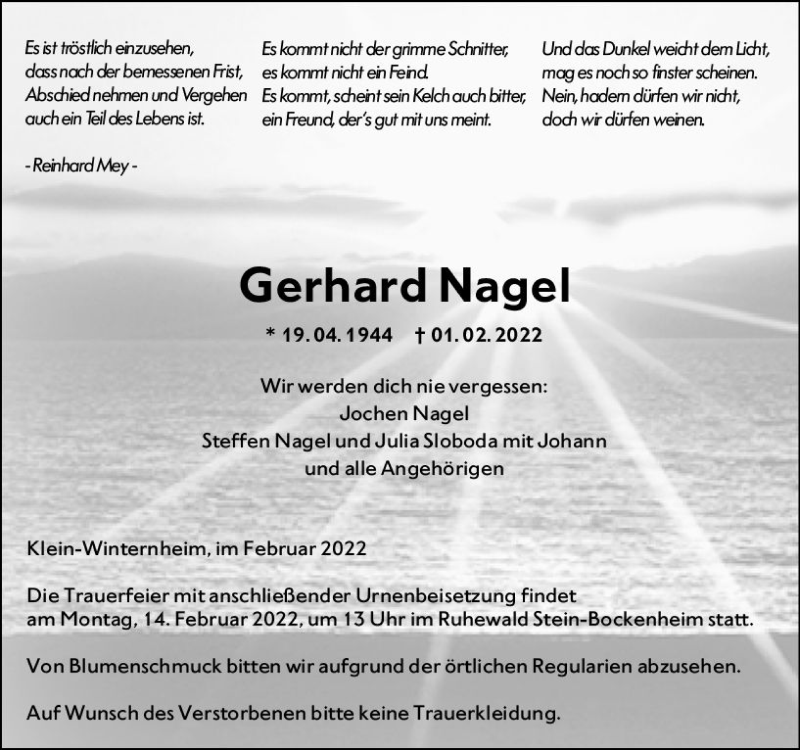 Hier finden Sie alle Traueranzeigen aus der Zeitung, die bisher für Gerhard Nagel erschienen sind. Weitere Traueranzeigen, die in der Zeitung erscheinen, werden hier ebenfalls aufgelistet