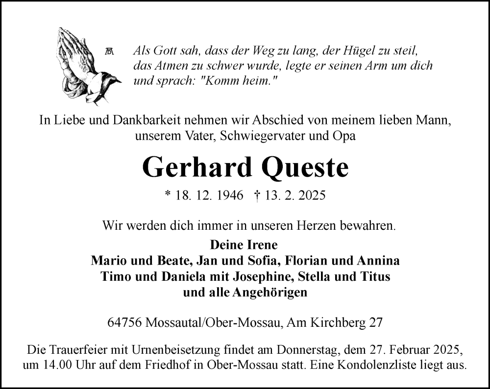 Hier finden Sie alle Traueranzeigen aus der Zeitung, die bisher für Gerhard Queste erschienen sind. Weitere Traueranzeigen, die in der Zeitung erscheinen, werden hier ebenfalls aufgelistet