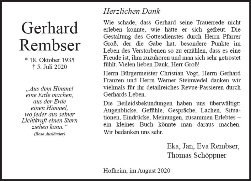 Hier finden Sie alle Traueranzeigen aus der Zeitung, die bisher für Gerhard Rambser erschienen sind. Weitere Traueranzeigen, die in der Zeitung erscheinen, werden hier ebenfalls aufgelistet