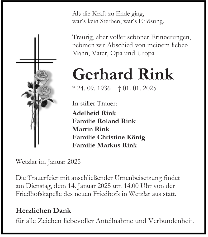 Hier finden Sie alle Traueranzeigen aus der Zeitung, die bisher für Gerhard Rink erschienen sind. Weitere Traueranzeigen, die in der Zeitung erscheinen, werden hier ebenfalls aufgelistet