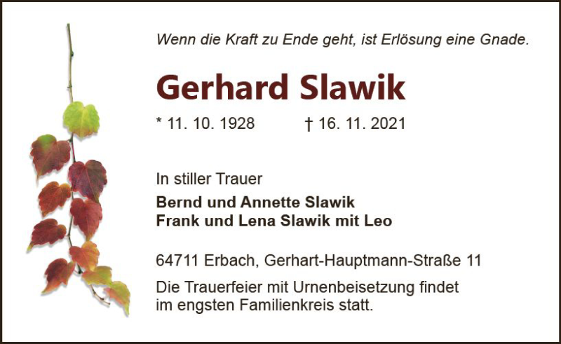 Hier finden Sie alle Traueranzeigen aus der Zeitung, die bisher für Gerhard Slawik erschienen sind. Weitere Traueranzeigen, die in der Zeitung erscheinen, werden hier ebenfalls aufgelistet