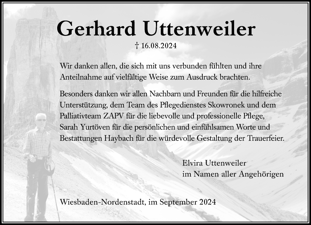 Hier finden Sie alle Traueranzeigen aus der Zeitung, die bisher für Gerhard Uttenweiler erschienen sind. Weitere Traueranzeigen, die in der Zeitung erscheinen, werden hier ebenfalls aufgelistet