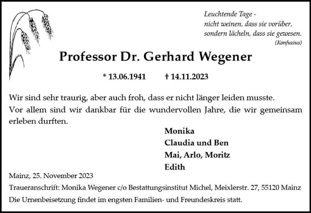 Hier finden Sie alle Traueranzeigen aus der Zeitung, die bisher für Gerhard Wegener erschienen sind. Weitere Traueranzeigen, die in der Zeitung erscheinen, werden hier ebenfalls aufgelistet