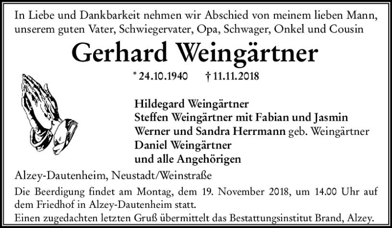 Hier finden Sie alle Traueranzeigen aus der Zeitung, die bisher für Gerhard Weingärtner erschienen sind. Weitere Traueranzeigen, die in der Zeitung erscheinen, werden hier ebenfalls aufgelistet
